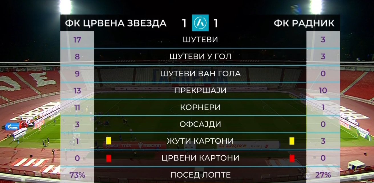 Na praznom stadionu, pošto je odradila i drugi meč bez publike, domaća ekipa nastavlja da trokira, ali bez konsekvenci jer su i pratioci kiksnuli. Povela je Zvezda 13. golom Kataija u sezoni u 53. minutu, ali su gosti golom Jovanovića izjednačili u 64. minutu. Imali su crveno-beli dosta prilika, Milson je pogodio prečku, a da je Radnik bio malo hrabriji u kontrama mogao je i do punog plena,